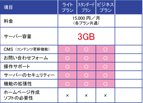 弊社サービスのサーバーの特長としましては、標準で3GBの大容量スペースをご提供しているところです。